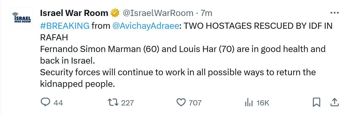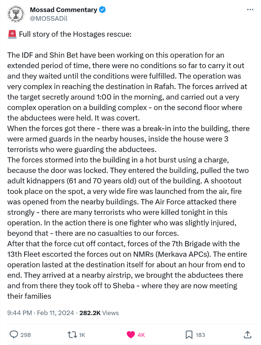February 12, 20241 yr Reports of two hostages rescued in Rafa, and three terrorists guarding them taken out. Great news.