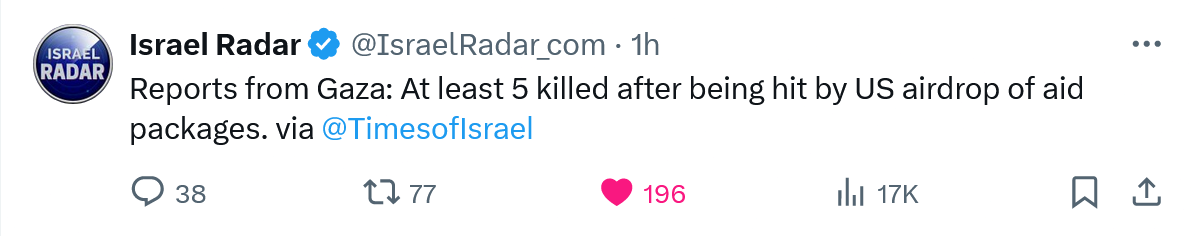 March 10, 20241 yr 4 minutes ago, Procus said: You were there - you know better than all those reports You posted a tweet you twit. Until there is evidence otherwise, I’ll believe our military. "The United States military denied responsibility, with its Central Command saying: "We are aware of reports of civilians killed as a result of humanitarian airdrops. We express sympathies to the families of those who were killed. Contrary to some reports, this was not the result of US airdrops.””