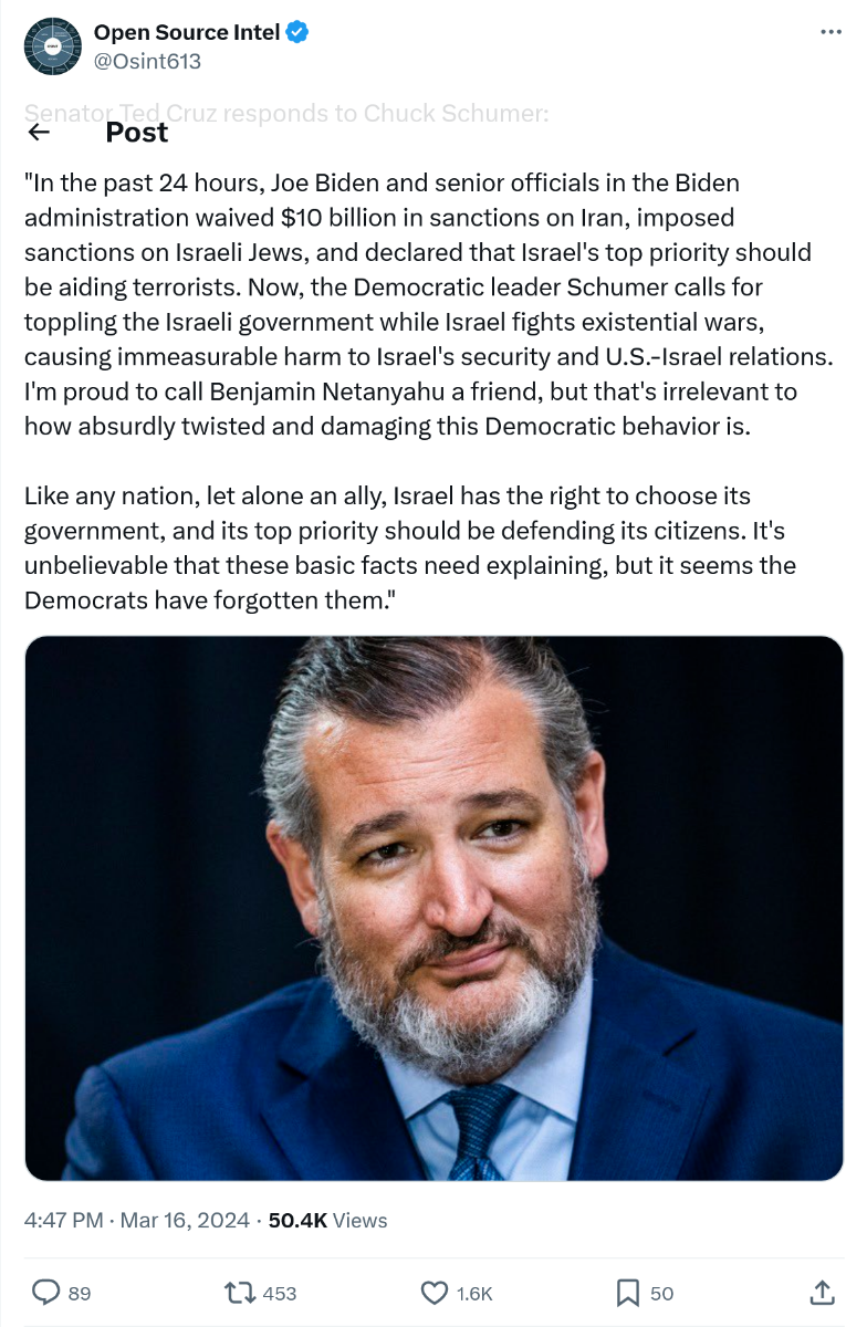 March 17, 20241 yr 28 minutes ago, Shepard Wong said: I find it difficult to object to Schumer’s actions when Netanyahu decided to insert himself and choose sides in American politics. In general, this isn’t ideal but Netanyahu’s blatant corruption and past history opened this door. I mean, of course he wants Trump to win. Biden is a strong supporter of Israel, but a lot of Dems want to put the brakes on the invasion of Gaza. Blinken has hedged in some of his recent comments.
