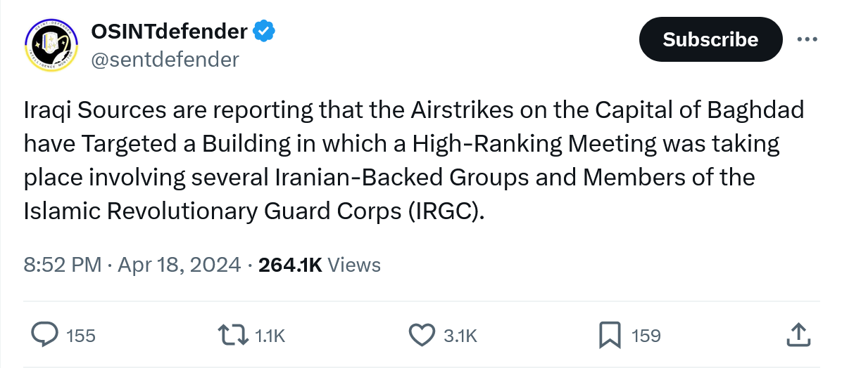 April 19, 20241 yr https://www.jpost.com/breaking-news/article-797866 Alleged Israeli strikes reported in Iran, Syria, Iraq Syrian reports indicated airstrikes targeted sites belonging to the Syrian Army in the As-Suwayda and Daraa Governorates of southern Syria.