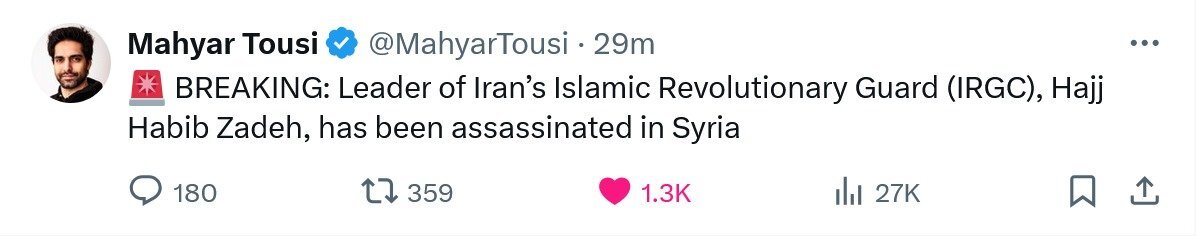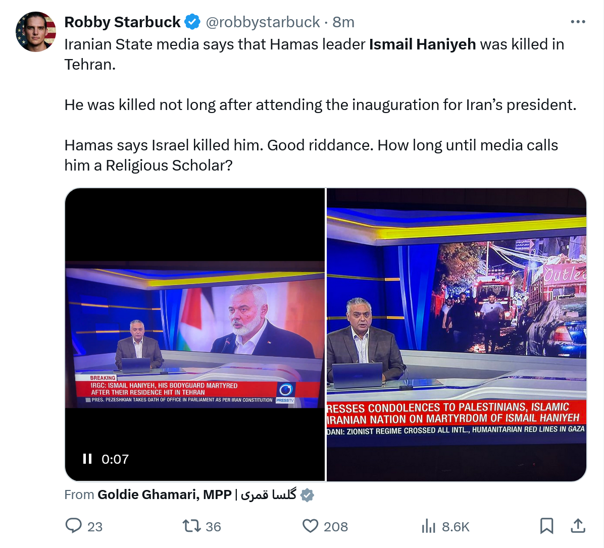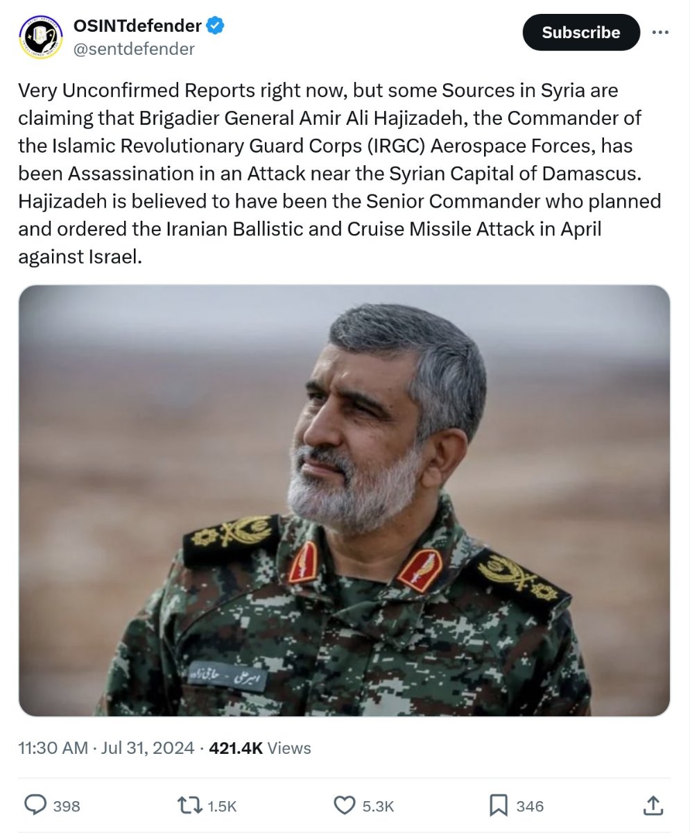 July 31, 20241 yr So for those keeping score, in roughly 24 hours: Fu’ad Shukr Ismail Haniyeh Hajj Habib Zadeh