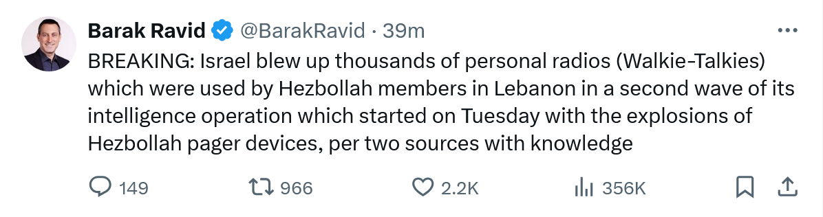 September 18, 20241 yr FWIW, my Israeli friends are telling me that there are reports of additional beepers exploding in Lebanon today. Bummer.