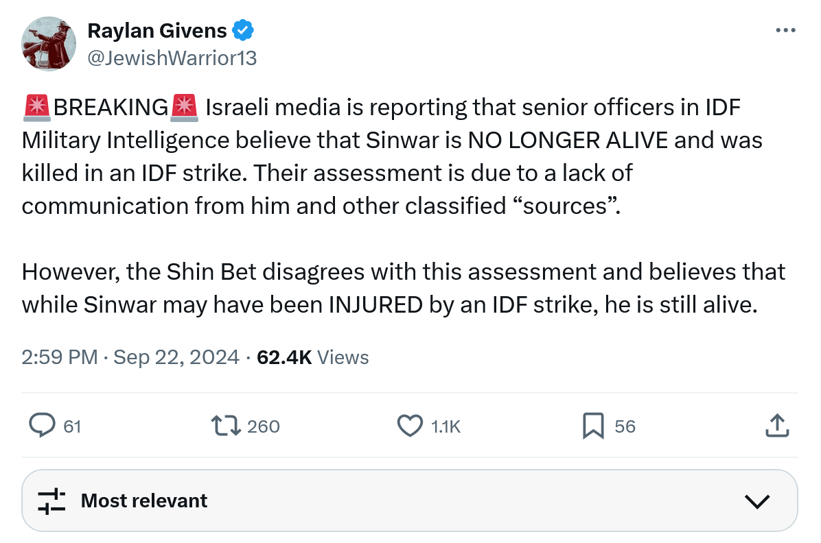 September 22, 20241 yr 12 minutes ago, Procus said: There has been no trace of Sinwar since the subject airstrike so... not really any news at all yet, sirens abound