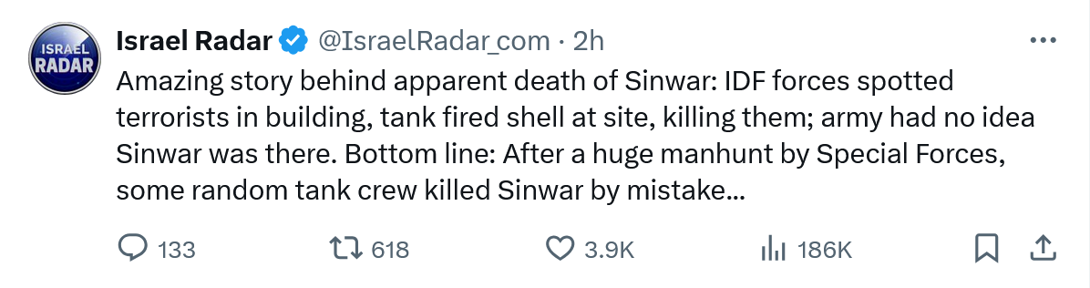 October 17, 2024Oct 17 Initial reports are that Sinwar has been killed. The IDF is conducting DNA testing to confirm. Wow! Don't post pictures of dead bodies.