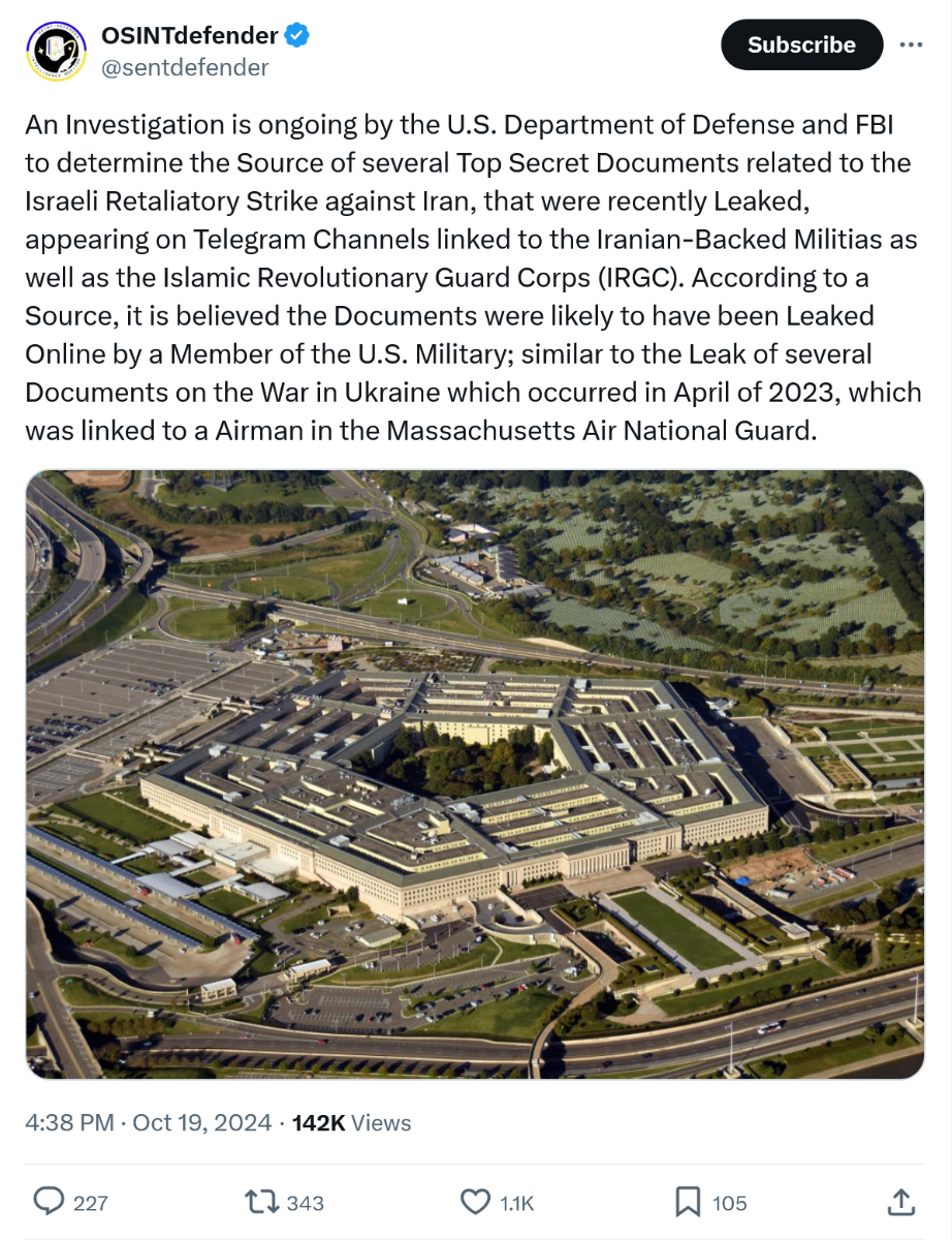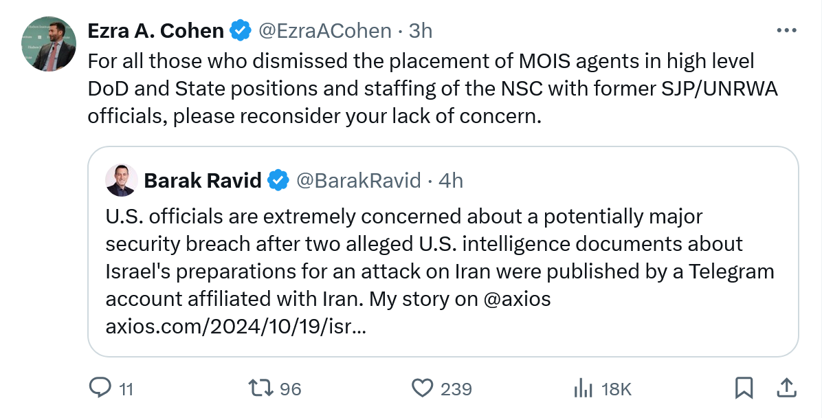 October 20, 2024Oct 20 3 hours ago, paco said: Leaked documents show US intelligence on Israel’s plans to attack Iran, sources say Every @Dave Moss, I mean squad and squad agecent, member of govt needs to get rooted out. This is as pro Russia as it gets Last time it was some serviceman who had too much access to classified documents. I don't think they were "squad adjacent", came from a military family.