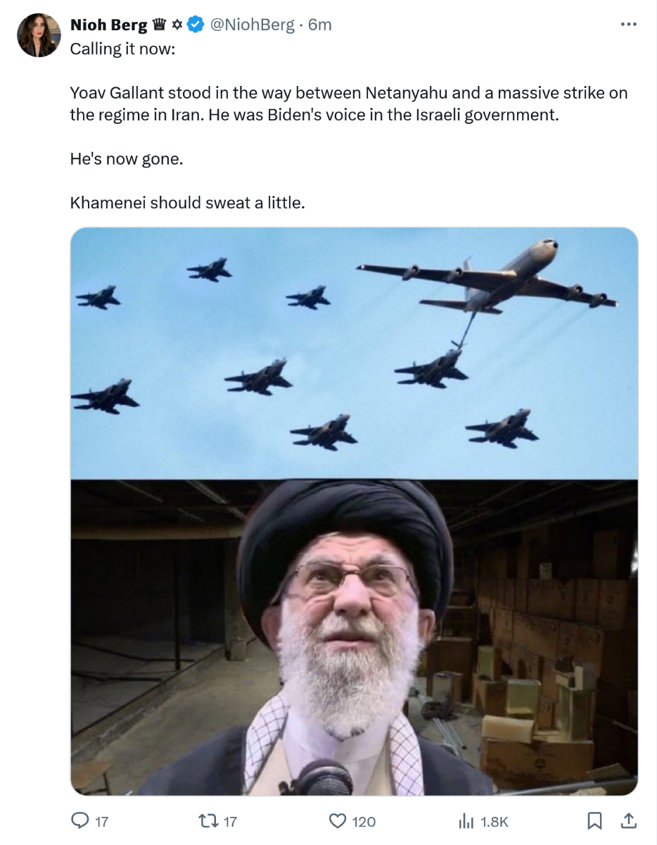 November 5, 2024Nov 5 So smack in the middle of U.S. Election Day, Bibi fires Defense Minister Yoav Gallant. FM Israel Katz moves to defense, Gideon Sa'ar to FM. This was a long time in the making, but the Biden administration insisted Gallant remain. Time ran out for him today. https://www.foxnews.com/world/israeli-prime-minister-benjamin-netanyahu-fires-defense-minister-yoav-gallant Israeli Prime Minister Benjamin Netanyahu fires Defense Minister Yoav Gallant Netanyahu citied diverging views and a lack of trust By Anders Hagstrom Fox News Published November 5, 2024
