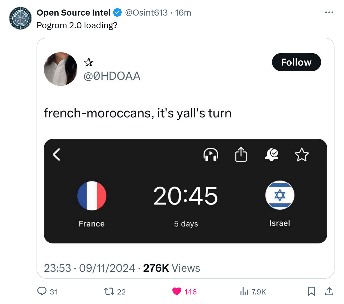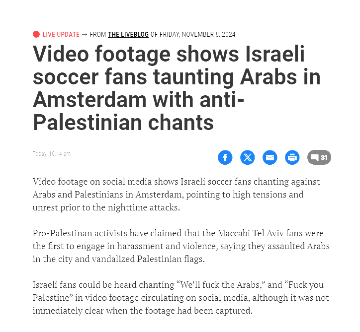 November 8, 2024Nov 8 A group of Israeli soccer fans chanting "death to Arabs,” ripping down Palastians flags, not honoring a moment of silence for flood victims prior to the game, all while in a foreign country, and they are now supposed to be the victims?
