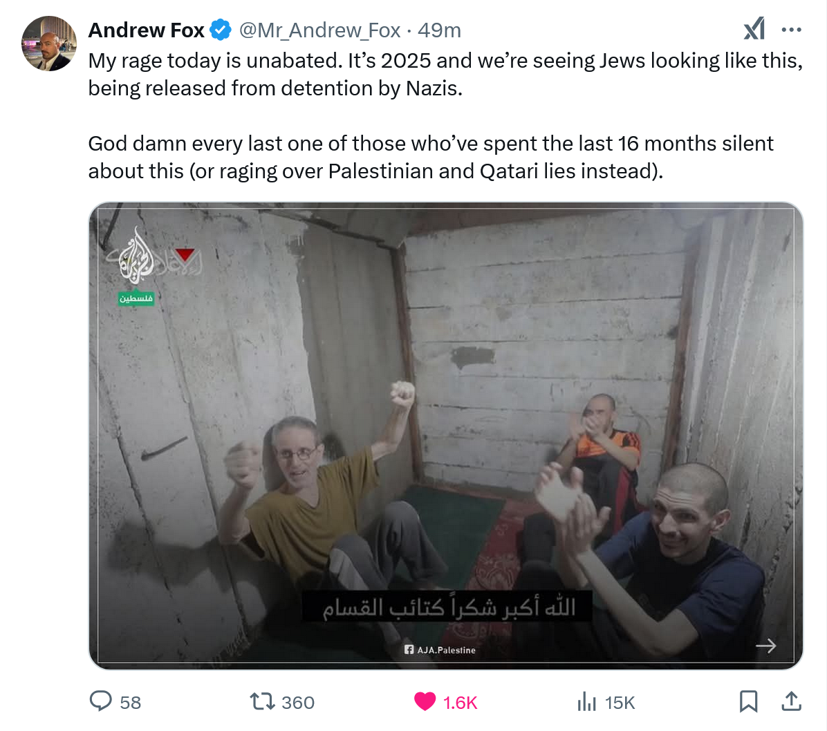 February 8Feb 8 35 minutes ago, Procus said: Three male prisoners were released today. They were all emaciated, reminiscent of Holocaust survivors. I read that Israeli medical teams had to dig up protocol for treating Concentration Camp victims. One of the prisoners released today didn't know that his wife and children were murdered on October 7 until after he was transferred to Israeli custody. People like Dave unwittingly support all of this with their naivety. It takes two to tango. Three I guess if you include the U.S.