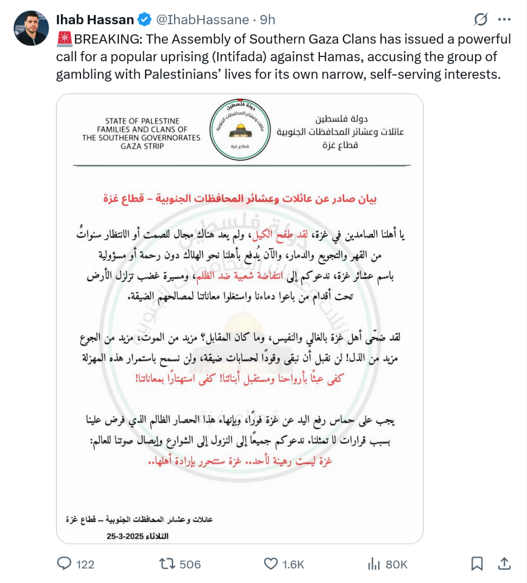 March 26Mar 26 5 hours ago, Procus said: You think the Assembly of Southern Gaza clans checked with Dave first? Yes, they text me their war plans