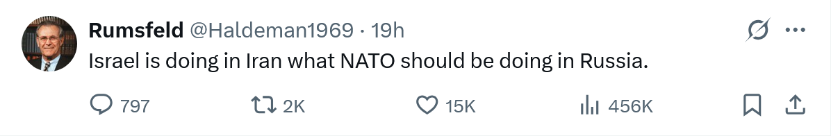 June 14Jun 14 Stopping by to give thoughts and prayers to our resident WWIII doomer crew. I know it's had to have been a tough few da...Wow, seems like they're into forever wars again. Gee, I didn't see that coming!