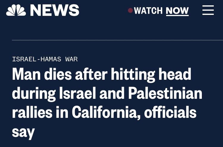November 7, 20231 yr FWIW, NBC news seems to have updated the headline saying "Jewish Man killed in altercation at Dueling pro-Isreal and pro-Palestinian rallies in CA" CNN has almost the exact wording as above headline, "Jewish man dies after suffering head injury at pro-Israeli and pro-Palestinian demonstrations in California" Fox News is pretty much the same as NBC's current headline, "Elderly Jewish man dies after confrontation with pro-Palestinian protester at California rally" Β