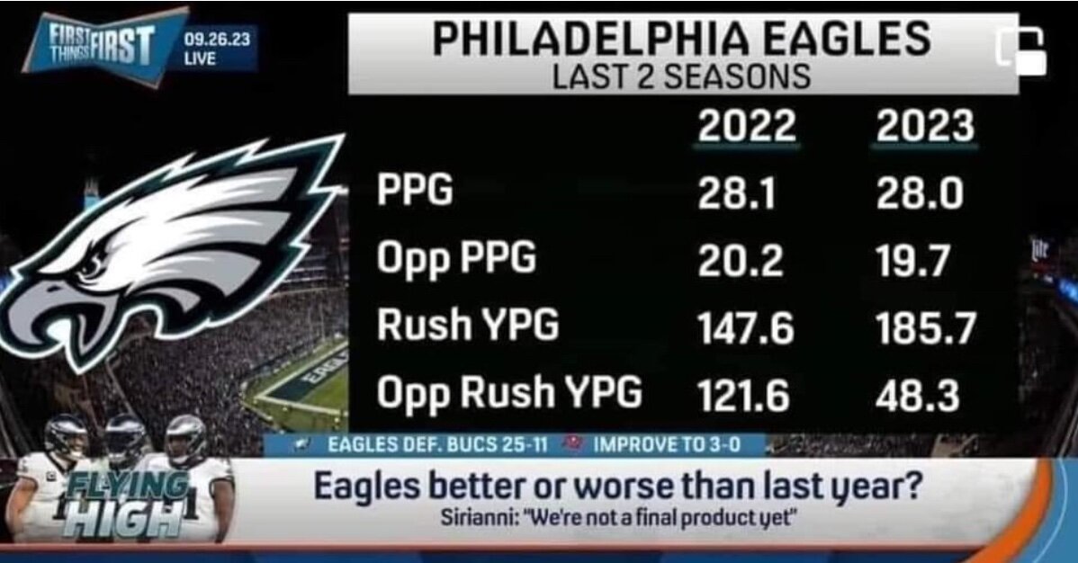 October 15, 20231 yr 1 hour ago, EazyEaglez said: People are looking for flash while the Eagles are out there just doing what they do. What does it look like after 5 games? Run D currently took a huge leap. I know that without looking.