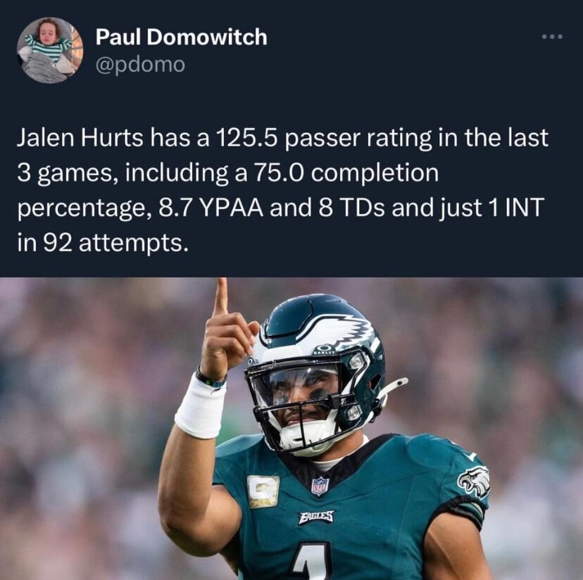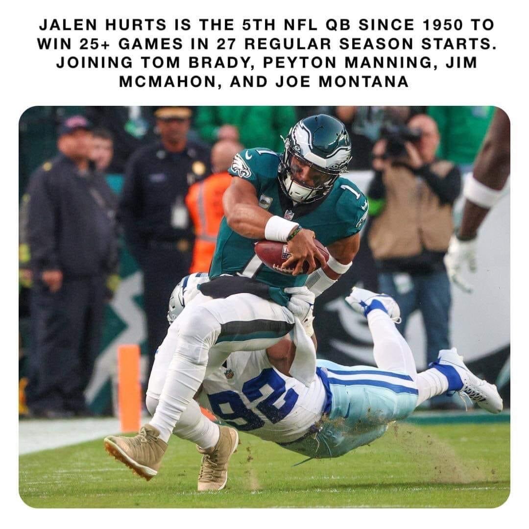 November 8, 20231 yr 12 hours ago, EagleFan85 said: Jalen Hurts is the toughest QB with some of the best leadership qualities I've ever seen. This is a guy you got to battle for. This is a guy that rises to the occasion in the most important moments and regardless of the situation. Are there areas he needs to improve? Of course there are and there always will be. But Jalen Hurts is the epidome of what we all should want an Eagles QB to look like. This thread should just go away at this point it's aging poorly. To think a lot of Eagles fans (myself included) ranted about getting Hurts in second round. That was because they had what was thought of a Franchise QB in Wentz at time. Philly.500 has a rant about when Hurts got drafted. This is, so far, the greatest stupid pick Howie has made. I'm guessing Howie may have had foresight that Wentz may not really be that guy. I read somewhere about not wanting to make same mistake they made in 2012 by waiting to draft a QB in third round (Russell Wilson).