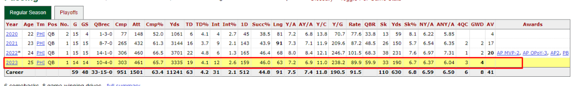 December 19, 20231 yr 4 minutes ago, Mat said: Umm, yes he was. That Ravens game he was 8-18 for 59 yards and 2 INT's. Kolb replaced him and was also awful throwing 2 picks himself. Hurts didn't have 59 yards and 2 interceptions with his replacement sitting on the bench. If you're even going to argue this stupidity at least have your facts right They aren't going to bring someone that's not even on the staff in to call plays when they don't even know the playbook He didn't call plays last year, he did it in his first season and I've said 3 times now I doubt he takes over due to not being able to focus on the other things and how he struggled with it in year one. You want facts? here you go: This is mcnabb in 2008 This is Jaylen 2023. so to say that mcnabb was not the franchise qb and he was behind for the "future" is pretty dumb. get your facts straight. Jaylen already has more int than mcnabb had that season and less TDs. so to me if you can't find a new OC right now, the other other option to spark the team is to bench hurts for a game or 2. so that perhaps the last game of the season and the playoffs he comes out on fire. agree he didn't call play last season. i meant the first year so i was incorrect in writing last year.