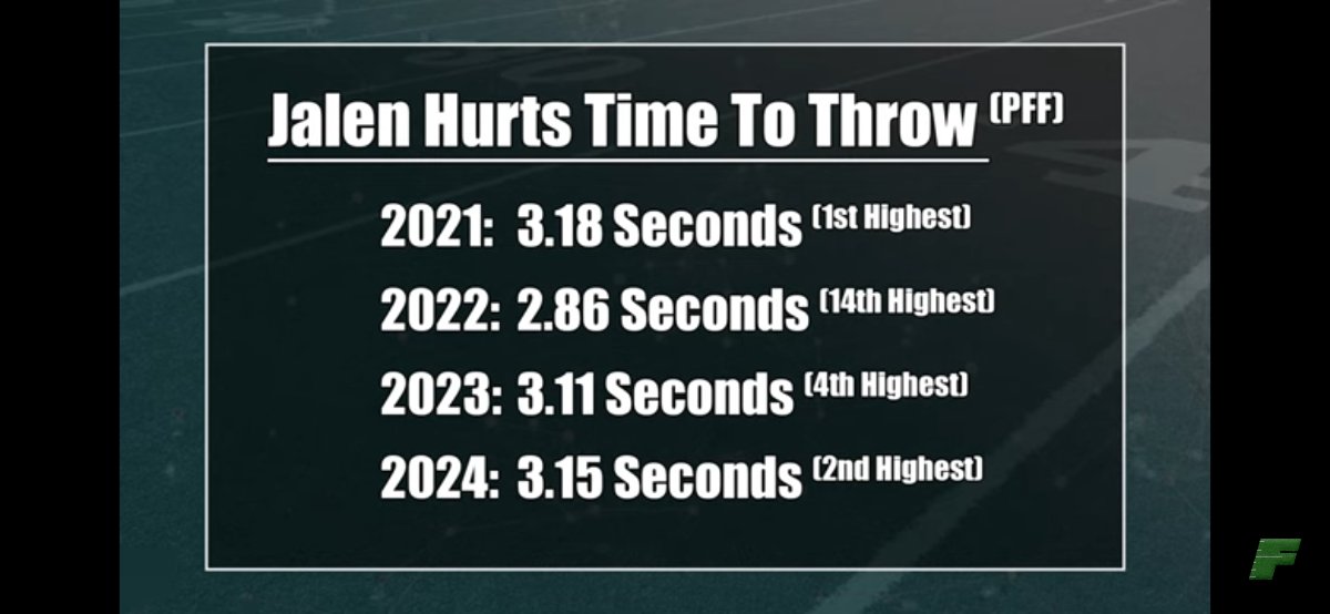 October 5, 20241 yr 6 minutes ago, brkmsn said: The way I see it, there are two camps: One camp that has limited or no patience and wants to see change at the first sign of negative play and the other that understands QBs take years to mature and likely will go through good and bad stretches during the maturation process. At this time, there's nothing I'm going to say to sway camp one. Most of them have never really been behind Jalen as our starting QB, predicted he would fail, and/or believed he wasn't an NFL QB. Many of them favor pretty passing stats over winning games (see the negative feedback after each win over the last 3 seasons) and have never really been impressed with a QB that only passes for just over 20 TDs a season. Honestly to me, it doesn't matter where Jalen "ranks" in subjective QB lists. I just want the team to win. I believe they can win with Jalen. I believe he can make plays that help us win games and have a winning record. I also believe he has flaws and can make bad plays that contribute to losses. I feel the same way about all the other starting QBs in the NFL. But Hurts is on my team and we won't be trading for any of the QBs you or the others think are currently better. Trevor Lawrence was supposedly the most sure thing coming out of college since Andrew Luck and he has yet to play a playoff game, has more career INTs and a lower career passer rating than Hurts. So finding the next guy is even less certain than continuity with a QB that people like you have ranked in the upper 1/3 of NFL starting QBs. So until Jalen does play better again, camp one has the "high ground" in discussions. Unfortunately, they don't really have any immediate solution. For me, I saw us win a Super Bowl with a backup QB (not even a top 30 guy) because we had a very good team full of role players that did their jobs --- including a tremendous catch (and receiving game) from an otherwise insignificant NFL RB. So while people finger point and nitpick Jalen every week, I'll keep hoping this group of players comes together like that roster in 2017. We are currently 2-2 on a team that could be 0-4 or 4-0 at this point. There's only one 4-0 team currently in the NFC and so 2-2 is far from out of the playoff picture and there's a lot of football left to play. I posted a few things above your post that show that 2022 seems to be the outlier and not a showing of progress with both his turnovers worthy plays and time to throw have both shot back up. I can post the breakdown for everyone. It shows Jalen ignoring basic route concepts consistently within this scheme that are fundamental for any qb to succeed. He also discusses the obvious physical breakdown Jalen has suffered at a young age with his explosiveness while running deteriorating at 25-26 years old. The guy had defended Jalen quite a bit in the past prior as well. I posted some of the graphics earlier from it