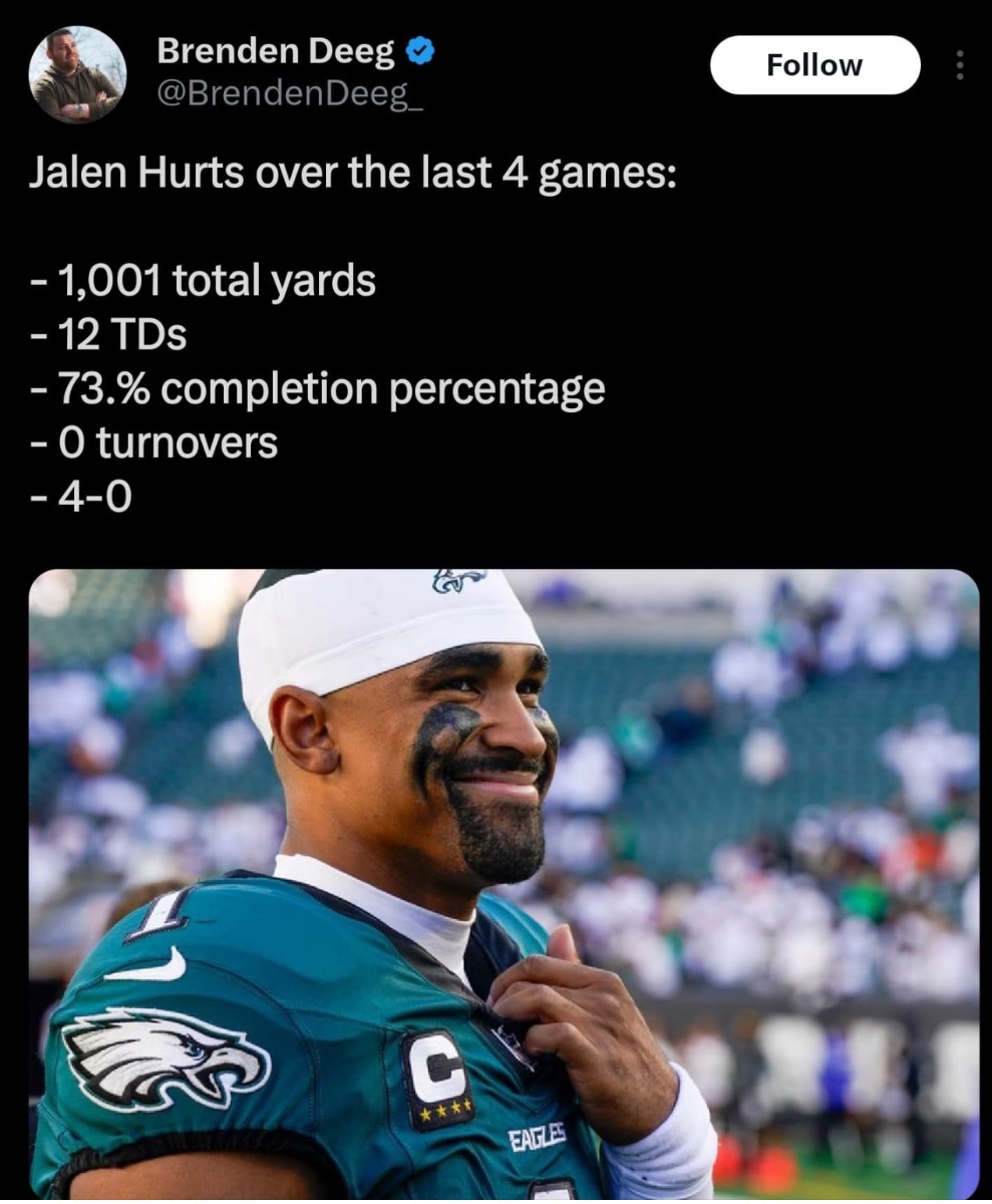 October 29, 2024Oct 29 Every time I want to bury Hurts, he has a nice game like today. Man, just be consistent so I can route for you.