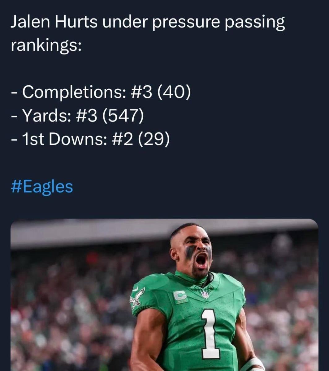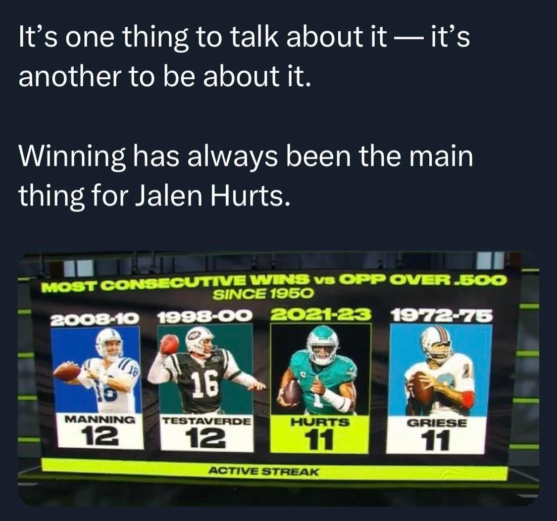 October 23, 20231 yr 36 minutes ago, NOTW said: I wouldn't call his play this season elite as this guy said, but posting for the video. Hurts IS standing in the pocket making throws. He IS delivering deep passes. He IS delivering throws with accuracy. And he doesn't lose confidence after mistakes. A lot of people were immediately overreacting when he threw the fluke INT off a guys helmet. But if you watch his demeanor after that, dude wasn’t rattled one bit. In fact, I had MORE confidence we were going to win after that because he won’t allow himself to be the reason we lose, he used that hiccup as an internal motivator to lead the team to victory. After that INT you could see him engage the stone cold killer mentality.