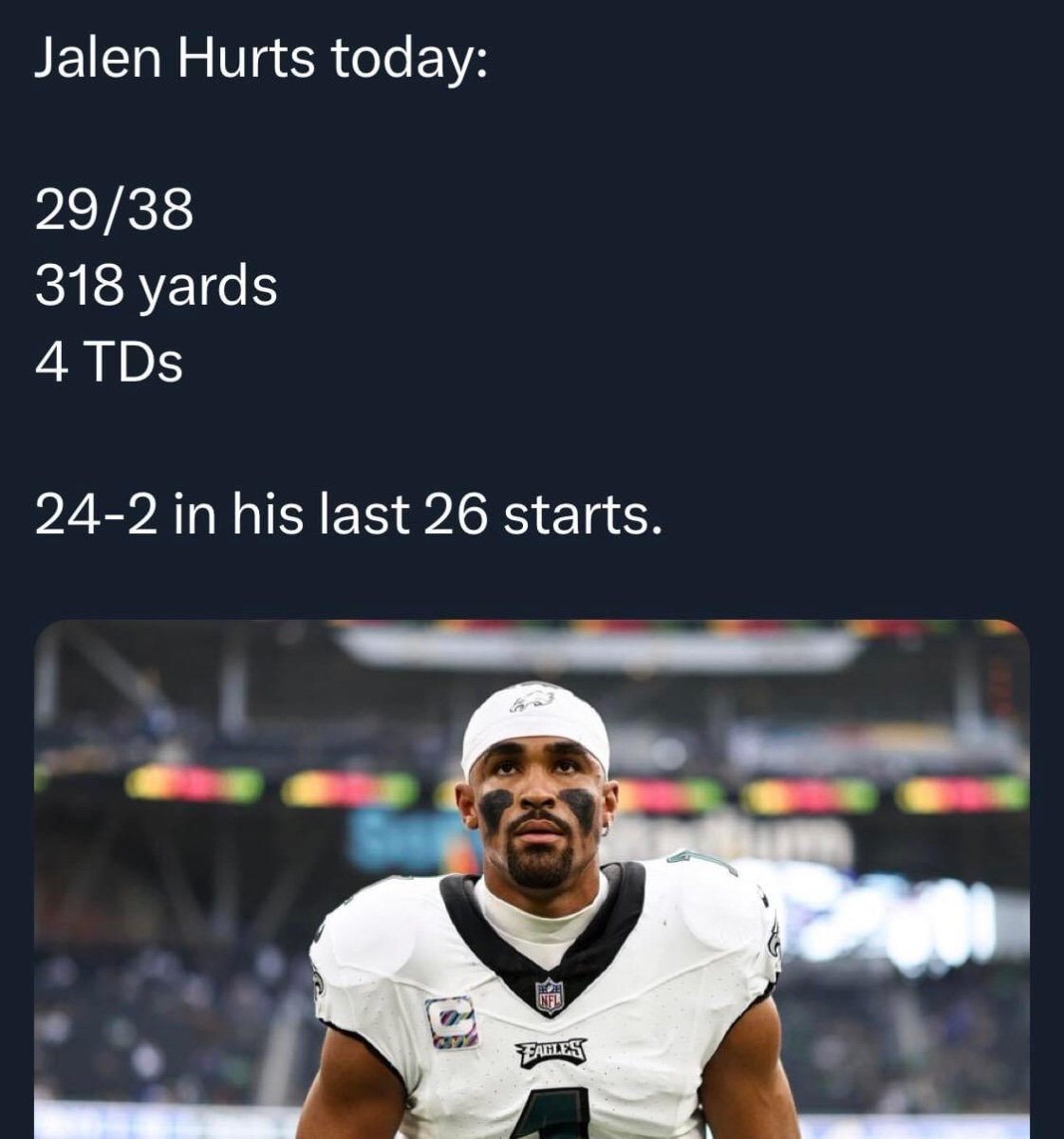 October 31, 20232 yr 9 hours ago, NOTW said: Philly fans are harsher on their own players than other teams. There are QBs around the league making mistakes, having bad games and playing through injury. Fans will call them gutsy, gritty, tough, overcoming adversity, leader, etc. Then Jalen overcomes mistakes, adversity, injury and WINS and while I think most fans support him there are still those that are so critical of him. He's had too many turnovers this year, yes. But when he steps on the field you can also be confident he will lead and bounce back to find ways to win. QB play outside of 5 guys is below average this year but people still won't appericate Hurts what he does for the team