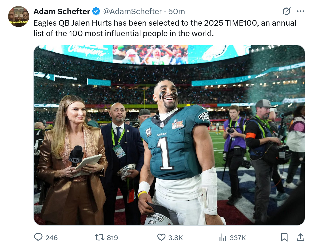 April 17Apr 17 17 hours ago, NOTW said:This topic is about Hurts. Start a new one about the battle for the backup.But, who does Jalen Hurts want as the backup? See how I made the backup discussion about Jalen.As Jalen's biggest Troll-Fan, I gotta keep this Jalen Hurts thread going.And, great to see Jalen getting the accolades that he has earned. Time 100. Signing with Jordan. Going to Disney World.Has anyone else noticed how click bait internet article headlines are like:"Mahomes lost a weapon" "Big News about Jalen Hurts' teammate"The stories aren't about the QB, but the clickbait headlines are.