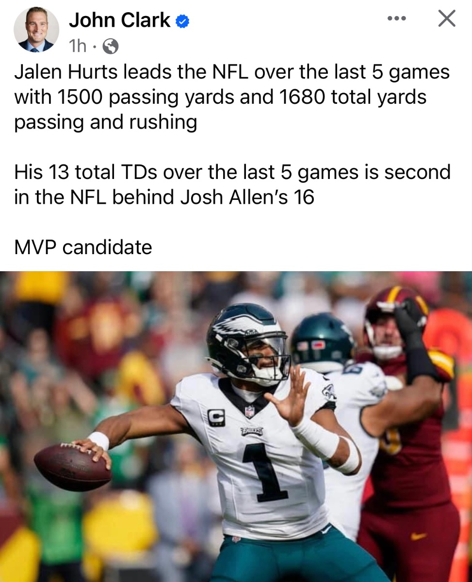 November 6, 20231 yr So Jalen has the Eagles at 8-1, is the current MVP favourite with 22 TDS and is doing this with a pretty bad knee injury. Anyone who thinks he is or was done is a genuine idiot.