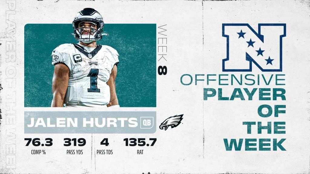 November 1, 20231 yr https://www.nbcsports.com/nfl/profootballtalk/rumor-mill/news/jalen-hurts-is-the-nfc-offensive-player-of-the-week