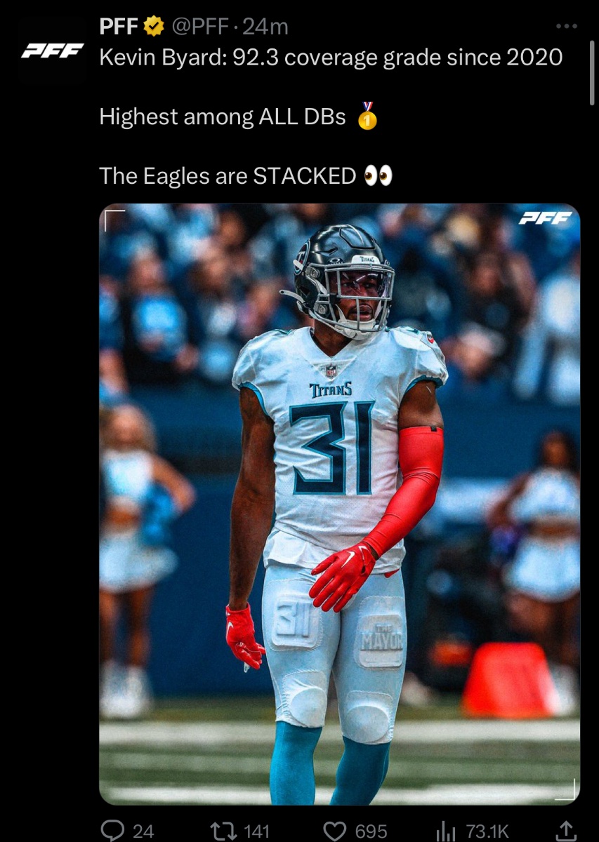 October 23, 20231 yr 5 minutes ago, ManchesterEagle said: I think he is still under contract for 2024, but the cap hit would be 14 million and there is seemingly no dead money in cutting him. It's highly unlikely the Eagles can keep a 31 year old safety on that basis, so maybe that's what people meant by one year rental. They could of course try and agree another restructure. The cap hit is very low this year. The fact that Howie was able to pull this off is really quite impressive. He didn't have much margin for error to work with here given the cap constraints for both this year and next year. To get a player of that caliber without having to really pay anything in terms of money or draft comp is threading quite the needle. Skeptical minds might remark that Byard is on the wrong side of 30 at a relatively insignificant position, and that we made a similar splash move for Robert Quinn last season that didn't materialize. But I disliked the Quinn trade from the start because we had loads of depth there and it was obvious he was cooked. This is much different. Byard's not only a terrific safety, but a very versatile one that can play the slot or in the box. Given slot corner and safety were the two most pressing needs following the Maddox injury, this is like getting a 2 for 1. It's also at a position that tends to age fairly well. This is probably only for this year, but I wouldn't be shocked if it worked so well he ends up staying longer. Very similar player to a guy like Jenkins and potentially a great leader as well.