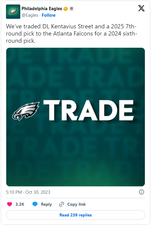 Posted October 31, 20231 yr Trade Talk Posted: October 30th, 2023 | Author: Tommy Lawlor The NFL’s trade deadline is Tuesday at 4pm. We got news of an outgoing trade today, but no news on Howie adding players to the Eagles. We can speculate for now, but will have to wait til Tuesday for any real news. Back to the trade that did happen. The Falcons lost DT Grady Jarrett on Sunday and needed DL help. Street wasn’t playing a lot with the Eagles. They can give his snaps to rookie Moro Ojomo. The Eagles have DT Thomas Booker and NT Noah Elliss on the practice squad so they’ve still got solid depth. So what is Howie doing to improve the team? This would be interesting. Haason Reddick and Josh Sweat are stud pass rushers. Brandon Graham might finally be showing his age. He’s got 0.5 sacks and 3 QB hits. After that you have rookie Nolan Smith and Derek Barnett. The team is mixing in Smith, but not a ton. I’m not sure they trust him to be on the field a lot right now. Barnett does not have a QB hit this year. He’s been okay vs the run, but isn’t pressuring the passer at all. Patrick Johnson has primarily been a STer. Finding pass rushers is tricky. The Eagles dealt for Robert Quinn last year and that didn’t work. Teams don’t want to give up good rushers unless you pay a lot for them. I don’t think Howie is looking to give up key assets. That’s just a guess on my part. Tuesday will give us real answers. We’ll see who the Eagles get. Or we’ll find out that there just wasn’t a deal to be made. ***** If you want to know what picks the Eagles have this year, Jimmy Bama has you covered. As long as the comp picks pan out as expected, the Eagles will be in good shape. ***** The Eagles added a bit more cap room. They are always tweaking contracts to maximize available money, for this year or the future. ***** There are things to fix on defense. Having some stability in the secondary would be a big help. Constant change has been an issue this year. Yikes. That number could go up if the Eagles deal for a DB. They could be looking for a nick if they aren’t sold on Bradley Roby, Sydney Brown and/or Eli Ricks. Or Josiah Scott. I hope Avonte Maddox realizes how inconvenient his injury has been. Very selfish of him to get hurt and miss the rest of the season. I thought Brown did some good things on Sunday. I’ve been impressed with Ricks in multiple games. Roby didn’t do a lot for me before he got hurt. This is another situation where the Eagles might want an upgrade, but the price has to be right. The Chiefs showed last year that you can win with young DBs. Find the right guys and give them a chance to play through their mistakes. The Eagles need to find long term solutions in the secondary. They can’t keep going through this kind of shuffle every year. ***** Sua Opeta got hurt late in the first half and rookie Tyler Steen had to take over at RG. Good job by the rookie. Did his job and the offense marched right down the field for a TD. Opeta came back out for the second half. It sounds like Cam Jurgens will probably be back this week. Nick Sirianni wouldn’t commit to anything at his press conference, but Jurgens was at the game on Sunday and moved without issue. We’ll see if the Eagles activate him from IR on Wednesday. I’m sure they would love to get him back. The run game hasn’t been the same without him. http://igglesblitz.com/2023/10/trade-talk-2/