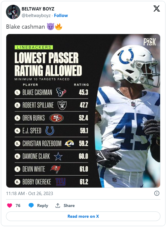 Posted October 31, 20231 yr Eagles reportedly 'poking around at linebacker': Here are some who make sense The Eagles are reportedly on the lookout for a linebacker ahead of the NFL trade deadline. Here are some players who could make sense for them. BY JIMMY KEMPSKI PhillyVoice Staff JENNA WATSON/USA TODAY NETWORK Colts LB Zaire Franklin Howie Roseman and the Philadelphia Eagles filled a hole last week with a trade for safety Kevin Byard, formerly of the Tennessee Titans. They're not done yet, according to The Athletic's Dianna Russini, who is reporting that the Eagles are "poking around at linebacker." At linebacker, Nicholas Morrow and Zach Cunningham have played above modest expectations, while Nakobe Dean has only played in four games due to injury. The Eagles don't typically like spending valuable draft resources on linebackers, whether that's through the draft itself or via trade. The Eagles have gotten adequate play from their linebackers, so if they do indeed add one at the trade deadline, it would likely have to be a player who is (a) clearly an upgrade on what they already have, and (b) not expensive. A trade similar to the one they made for Byard — a couple of Day 2 picks and a backup player they no longer needed — would make sense. Some linebackers who makes sense for the Eagles: Zaire Franklin (27, 6'0, 235), Colts Like Byard, Franklin is from the Philadelphia area, and if you'll recall from this summer, was involved in a melee during Eagles-Colts joint practices. He signed a three year, $10 million contract with the Colts during the 2022 offseason, and is under contract through 2024. After eight weeks, Franklin leads the NFL with 102 tackles, and is a tough, violent player. At 27 years of age, he is probably a better fit for a contender than he is for a rebuilding team in the Colts, who have also lost their starting quarterback for the season. Blake Cashman (27, 6'2, 235), Texans Cashman was a Jets fifth-round pick in 2019 who has very good athleticism: Cashman battled injuries early in his career, but is having a good season for the Texans. The Eagles' current group of linebackers have all been good against the run, but Cashman would give them a linebacker who has been particularly good in coverage this season. The Texans have shown nice improvement this season, but they are 3-4, which leaves them 2.5 games behind the Jaguars in the AFC South. Even if they were a little closer to Jacksonville, this is obviously not a Super Bowl contender even if they may be heading in the right direction. Cashman is scheduled to become a free agent this offseason, so they may as well get a Day 3 pick for him now. Jeremy Chinn (25, 6'3, 220), Panthers We have already covered Chinn extensively here (sorry for the repeat), but he sort of evaporated off Eagles fans' radar when he suffered a quad injury that could keep him out until around early December. If you'll recall, Chinn is the player the Eagles would have selected in the second round of the 2020 draft if they hadn't taken Jalen Hurts, and he is a player the Eagles were sniffing around before he got hurt, per a league source. According to PFF, Chinn's snaps have been split so far this season like so: Slot Box safety Outside corner Edge Deep safety 103 70 14 9 1 As you can see, he almost exclusively plays near the line of scrimmage, which more or less makes him a linebacker, even if he's listed as a safety. You don't want Chinn covering speedy receivers, but he can run with tight ends. He's also physical in run support, and can blitz: I wouldn't view Chinn as a starter on the Eagles' defense, but he could be a versatile sub-package player who should cost very little to acquire via trade. They would just have to wait a little while until he can play, but for a team that (spoiler) is going to the playoffs, the games in January mean more than the ones in November. https://www.phillyvoice.com/eagles-reportedly-poking-around-linebacker-here-some-who-make-sense-howie-roseman/