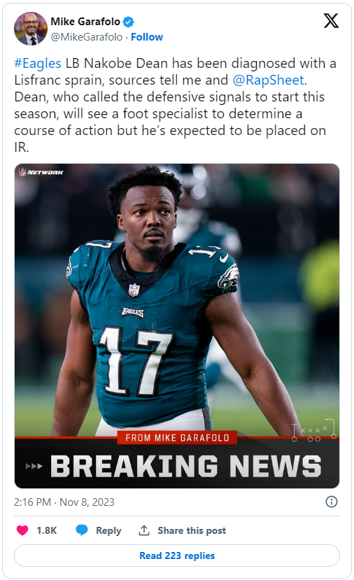 Posted November 9, 20232 yr Nakobe Dean reportedly expected to head to IR again A frustrating season for Nakobe Dean keeps piling on as the young LB is reportedly expected to head back to IR. By Dave Zangaro • Published November 8, 2023 Eagles linebacker Nakobe Dean is expected to head back to Injured Reserve, NFL Network’s Mike Garafolo reported on Wednesday. According to the report, Dean suffered a Lisfranc sprain against the Cowboys on Sunday afternoon and will see a foot specialist. When Dean left the field, he slammed his helmet to the ground, walked inside with a trainer and did not return. This will be the second stint on IR for Dean this season with a foot injury. This injury doesn’t necessarily end Dean’s season. Players can be designated to return from IR twice per season. But the 2023 campaign is certainly not going how Dean expected. The 22-year-old came into the season as the Eagles’ MIKE linebacker and signal caller but got hurt in the season opener against the Patriots and missed four games. Upon his return on Oct. 15, Dean found himself in a linebacker rotation with Nicholas Morrow and Zach Cunningham. And after just four games in that rotation, Dean (who never missed a game at Georgia) is already hurt again. It’s also worth noting that Dean hasn’t played exceptionally well when he has been on the field. In five games this season (four starts), Dean has 30 tackles, half a sack, 2 TFLs and 1 QB hit. He’s been better against the run than the pass. The Eagles basically gave Dean a redshirt rookie season behind T.J. Edwards and Kyzir White in 2022. But the team was ready to insert the third-round pick from Georgia into the starting lineup in 2023. He was the MIKE linebacker all spring and summer and in the first start of the season. But a frustrating year keeps piling on. For however long Dean is out, the Eagles will rely on Morrow and Cunningham. Morrow didn’t even make the Eagles’ initial 53-man roster out of training camp and Cunningham didn’t sign with the team until August. But both have played above expectations this season. This injury does leave the Eagles light with linebacker depth. Their only pure linebacker on the bench is Christian Elliss. They do have Ben VanSumeren and Brandon Smith on the practice squad. https://www.nbcsportsphiladelphia.com/nfl/philadelphia-eagles/nakobe-dean-reportedly-expected-to-head-to-ir-again/545402/