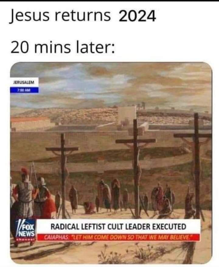 January 18, 20241 yr 20 minutes ago, Toastrel said: A man preaching love your neighbors (all of them), welcoming immigrants with open arms, and tossing the money lenders, is about as anti-right as you can be these days. Welcoming immigrants, tossing money lenders. You have no idea what you're talking about. Go Google "Jesus" again