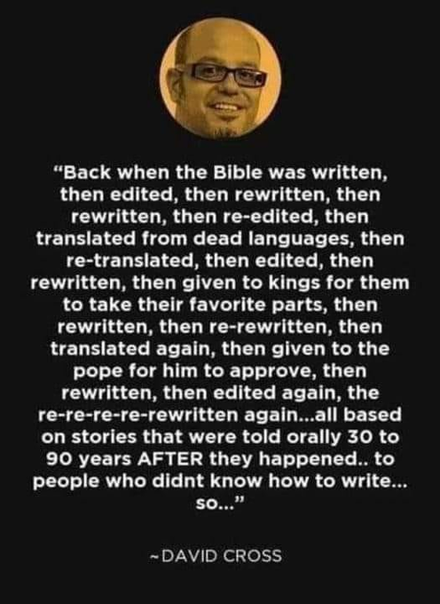 May 8, 20241 yr The oldest collection of Christian texts dates to 4 centuries AFTER Jesus. 400 years. How many times were the original copied and recopied, and translated, and mistranslated. Like say "Thou shalt not suffer a witch to live." Should probably read, "Thou shalt not suffer a poisoner to live."