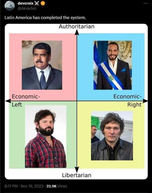 November 20, 20231 yr 17 minutes ago, Kz! said: Libertarian candidate beats socialist candidate in Argentina. US "libertarians" now seething. I don't know anything about this dude. Is he a libertarian or is he a "libertarian", like pro-signed-checks-from-the-government MAGA?