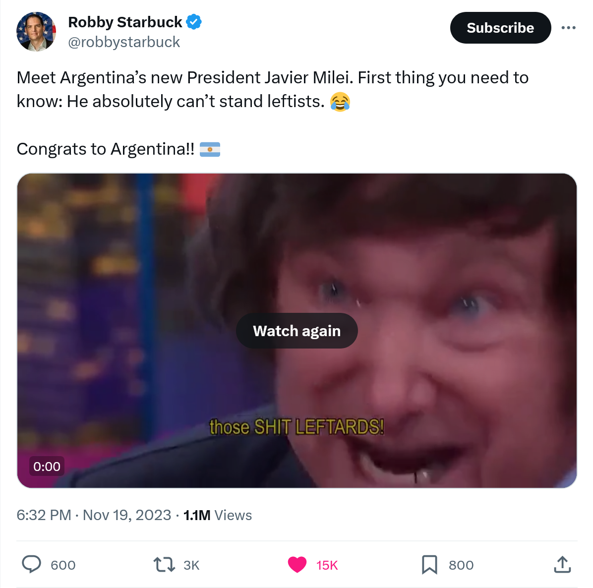 November 20, 20231 yr Absolute madness. But not shocking. The incumbent uniparty was a train wreck and rural Argentina is about as uneducated and stupid as you'll find anywhere in the world.