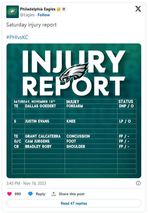 Posted November 20, 20231 yr Eagles rule out TE Dallas Goedert, DB Justin Evans for MNF matchup vs. Chiefs The Eagles are getting healthier at the right time, but the team will be without tight end Dallas Goedert and safety Justin Evans for Monday night’s matchup against the Chiefs. Goedert is the only player on the active roster who will miss Monday night’s game against the Chiefs due to injury. He suffered a forearm injury in the win over the Cowboys, but is not going on Injured Reserve. Eagles tight end Grant Calcaterra (concussion), right guard Cam Jurgens (foot), and cornerback Bradley Roby (shoulder) were all full participants this week and are cleared for action on Monday. Ruled out PHILADELPHIA, PENNSYLVANIA – NOVEMBER 05: Dallas Goedert #88 of the Philadelphia Eagles is tackled by Damone Clark #33 of the Dallas Cowboys during the third quarter at Lincoln Financial Field on November 05, 2023 in Philadelphia, Pennsylvania. (Photo by Tim Nwachukwu/Getty Images) TE Dallas Goedert (arm) S Justin Evans (knee) FULL PARTICIPANTS Oct 1, 2023; Philadelphia, Pennsylvania, USA; Philadelphia Eagles center Cam Jurgens (51) blocks Washington Commanders linebacker Cody Barton (57) at Lincoln Financial Field. Mandatory Credit: Eric Hartline-USA TODAY Sports TE Grant Calcaterra (concussion) G Cam Jurgens (foot) CB Bradley Roby (shoulder) Chiefs game status Sep 17, 2023; Jacksonville, Florida, USA; Kansas City Chiefs wide receiver Richie James (17) runs with the ball against Jacksonville Jaguars during the first quarter at EverBank Stadium. Mandatory Credit: Morgan Tencza-USA TODAY Sports For Kansas City, only Richie James is questionable for Monday night’s game. https://theeagleswire.usatoday.com/lists/dallas-goedert-injury-eagles-chiefs-week-11-taylor-swift-justin-evans/