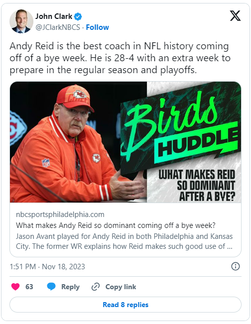 Posted November 20, 20231 yr Game Preview – PHI at KC Posted: November 19th, 2023 | Author: Tommy Lawlor There are a ton of storylines to Monday night’s matchup between the Eagles and the Chiefs. There’s the Andy Reid angle. There’s the Kelce brothers angle. There’s the Taylor Swift angle. There’s the Hurts-Mahomes angle. This is also a Super Bowl rematch. For Nick Sirianni, this is just the Eagles vs the Chiefs. That’s the mentality he wants his team to have. Some have asked if this is revenge for the Eagles. As Sirianni pointed out, an Eagles win wouldn’t mean the Chiefs turn over their Super Bowl rings. The goal here has nothing to do with the past. It is all about getting to 9-1. Win the day. I am conflicted about what’s going to happen. You can make a compelling argument for both teams to win. We’ll start with the Eagles. The pass rush, which wasn’t much of a factor in the SB, should have an impact on Monday night. KC has an outstanding trio of interior blockers, but their OTs are vulnerable. I would expect Haason Reddick and Josh Sweat will get pressure. Getting Patrick Mahomes on the ground is not easy. Getting into the backfield is the start of the challenge. The really hard part is finishing the play. Mahomes has great escapability. KC didn’t have great passing success in the SB. They ran for 158 yards and that was a key part of their offense. The Eagles have the best run defense in football this season. They aren’t vulnerable the way they were last year. Limit the run game and make KC throw from known passing situations. Mahomes is still an elite QB, but the Chiefs offense has taken a step back this year. They are 13th in points scored. KC just doesn’t have the weapons they’ve had in the past. Rashee Rice is their leading WR at 32-378-4. Those numbers don’t jump out at you. Rice has played better recently so maybe the light is going on for him. Turnovers have been an issue for KC. They have at least one turnover in 8 of 9 games this year. They have multiple turnovers in five of those games. The Chiefs have an outstanding defense, but you can run on them. They have given up 108 or more rushing yards in 7 of 9 games. The Eagles OL will get a boost from the return of Jurgens. The replacement guards struggled in the run game so getting Jurgens back is important. Jalen Hurts and the passing game have been performing at a high level in recent weeks. If the run game can pick things up, that would be huge. D’Andre Swift has run for 180 yards over the past four games. You might remember he went for 175 yards in Week 2 against the Vikings. Jurgens won’t magically turn Swift into Barry Sanders, but he will make a difference. Hurts and the offense are hot. The Eagles are third in the league in scoring. They average 32 points a game for the past three weeks. The Eagles put 28 points up on Dallas and their Top 4 defense so it isn’t like the team is just beating up on weak defenses. There is a lot of reason to believe the Eagles are going to win this game. Now let’s talk about what favors the Chiefs. Mahomes is still Mahomes. His numbers are down, but he remains the best QB in the league. And he’ll be facing a porous pass defense. The Eagles are 28th in the league in opposing passer rating (99.4). That’s not good. The Eagles are 28th in passing yards allowed and they are dead last in passing TDs allowed. Mahomes is going to make plays. While KC doesn’t have great weapons, they still have Travis Kelce, the best TE in football. He is Mahomes favorite target and their best playmaker. The Eagles do have Kevin Byard, who has had some success in covering Kelce. It will be interesting to see what Sean Desai does. The Eagles will also have Bradley Roby back on the field. That gives Desai a solid group of veteran DBs to work with. They should at least be able to slow down the Chiefs. Both teams are coming off a bye. Nick Sirianni is 3-0 in games after the bye in the regular season, 4-0 if you include the playoffs. That’s nice. Yikes. Big Red has always been masterful at fixing issues with his extra time. Desai will study the Chiefs offense and have an idea of how to attack them. But we don’t know what he’ll see on Monday night. Reid will have some new wrinkles. He’ll break tendencies. The Chiefs are never easy, but coming off a bye makes them even tougher. Hurts and the Eagles offense will have their hands full with the KC defense. Steve Spagnuolo’s defense has allowed the fewest points in the league. No one has scored more than 24 points against them. They are also 4th in yards allowed. Nothing comes easy against the Chiefs. Chris Jones is still their best player. Jurgens returns just in time to face arguably the best DT in the league. Welcome back, right? George Karlaftis and Mike Danna are the disruptive edge rushers. That trio has combined for 17 sacks. The secondary has been terrific this year. KC played young DBs a lot last year and that experience has paid off this season. CB Trent McDuffie seems to make a play in every game I watch. LB Nick Bolton came up huge in the Super Bowl, but he’s on IR. The Chiefs still have a trio of LBs who can make plays so don’t feel too sorry for them. The Eagles feel like the better team, but playing Mahomes in KC when the Chiefs are coming off a bye is one heckuva tough task. Be careful about betting your lunch money on the Eagles in this one. ***** The first miracle. http://igglesblitz.com/2023/11/game-preview-phi-at-kc/#disqus_thread