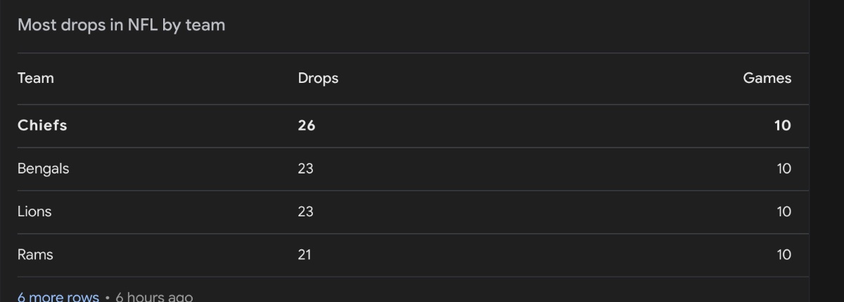 November 21, 20231 yr 4 hours ago, EmeraldArcher7154 said: chiefs had a lot of crucial drops. Dropping passes is what the Chiefs do. Yet they’re still 7-3 and probably will win the AFC.