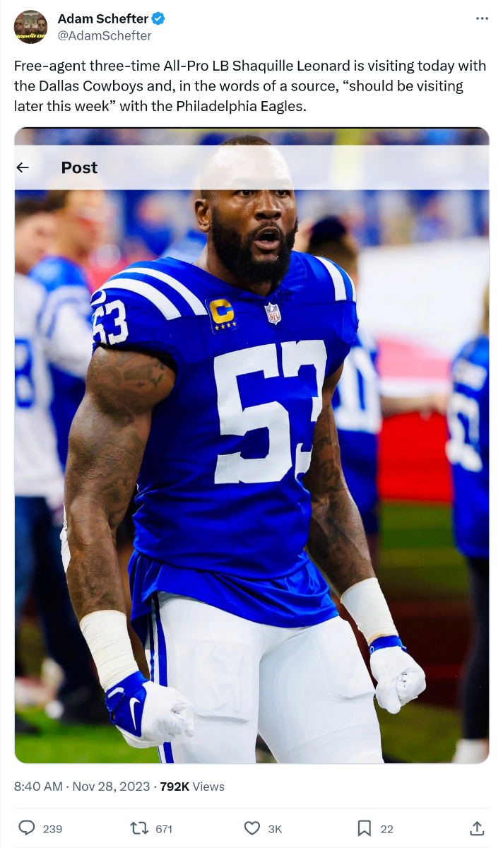 November 28, 20231 yr Leonard plans to visit but scheduled to visit Dallas first. https://www.nbcsportsphiladelphia.com/nfl/philadelphia-eagles/three-time-all-pro-linebacker-shaq-leonard-expected-to-visit-eagles/548781/