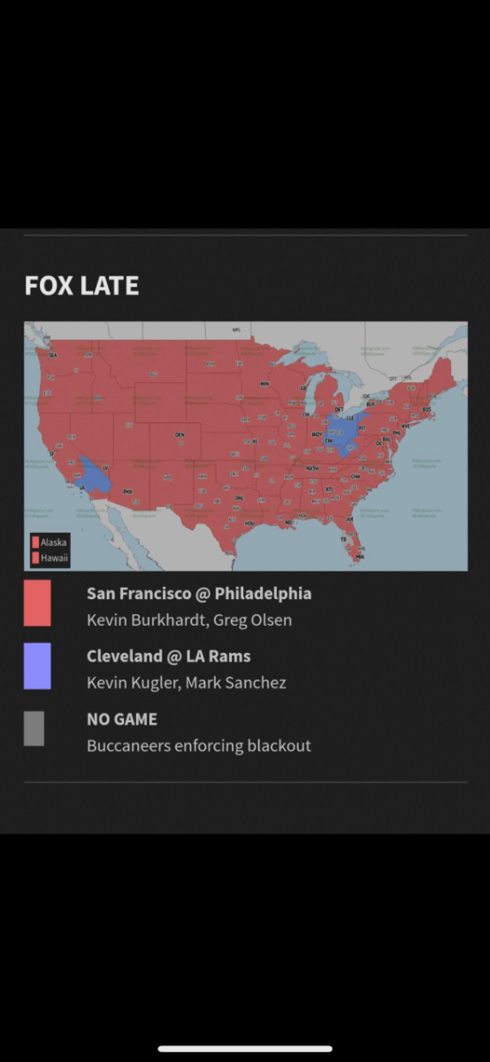 November 30, 20231 yr I live in Charlotte. The Panthers-Bucs game is on at 4:30. SF-Philly is such a big game that FOX WILL BE PLAYING IT INSTEAD OF THE HOME TEAM IN MY AREA. For biased reasons I love it, for practical reasons this should never happen