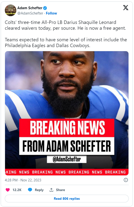 Posted November 24, 20231 yr Report: Eagles expected to have interest in former Colts LB Shaquille Leonard Leonard, a three-time All-Pro, made it through waivers unclaimed while the Eagles still have a need at linebacker. BY JIMMY KEMPSKI PhillyVoice Staff JIM DEDMON/USA TODAY SPORTS Former All-Pro LB Shaq Leonard made it through waivers and is free to sign with anyone. On Tuesday, the Indianapolis Colts waived All-Pro linebacker Shaquille Leonard. On Wednesday, Leonard passed through waivers unclaimed, and is now an unrestricted free agent free to sign with any team. According to Adam Schefter of ESPN, the Philadelphia Eagles and Dallas Cowboys are expected to have interest. Leonard was a Colts second-round pick in 2018. In his rookie season, he led the NFL with 163 tackles, and also had 7 sacks, 4 forced fumbles, 2 INTs, and 8 pass breakups on his way to earning NFL Defensive Rookie of the Year and First-Team All-Pro honors. He was also an All-Pro in 2019, 2020, and 2021. In 2022, he had two surgeries on his back, and only played in 3 games. In 2023, Leonard was unhappy with his diminished role. He has made 65 tackles in 9 games, but has not been the elite player he once was. The Eagles' reported interest in Leonard passes the smell test. The Athletic's Dianna Russini reported prior to the NFL trade deadline that the Eagles were "poking around at linebacker." Nakobe Dean has since gone on injured reserve for the second time, so the Eagles' interest in linebacker has likely only increased since Russini's reporting. Nicholas Morrow and Zach Cunningham have played above modest expectations, and the only other linebacker on the 53-man roster is Christian Elliss. The Eagles need more depth at linebacker. The Cowboys make sense as a landing spot for Leonard as well. They lost starting LB Leighton Vander Esch indefinitely to a neck injury. So, it could be an NFC East bidding war for Leonard's services. https://www.phillyvoice.com/report-eagles-expected-have-interest-former-colts-lb-shaquille-leonard/