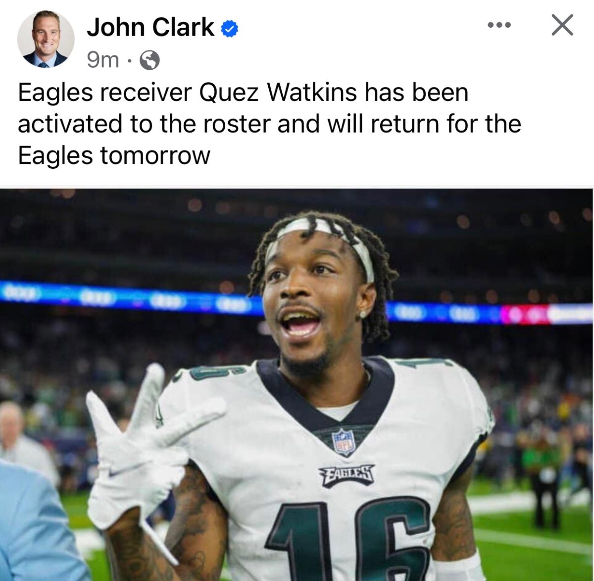 November 26, 20231 yr 9 hours ago, time2rock said: That open roster spot created by waiving Barnett was used to add Quez Watkins back to the active roster from IR. What’s weird is he’s basically still questionable and still hasn’t really practiced.
