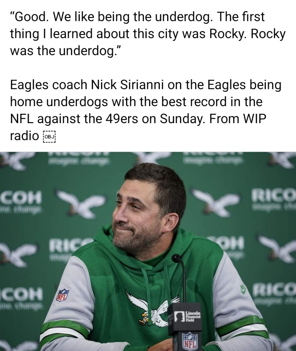 November 29, 20231 yr 1 hour ago, NYEagle said: Something tells me this is just setting up badly for the Eagles....all their injuries, Cunningham, Cox, Goedert.....revenge by the 9'ers who are playing really good ball. Like I said, I want the Eagles to win, wouldn't shock me if they do (especially with the way they never give up) but even if they lose, they are still in pretty good shape to get the #1 seed. The problem is if we lose to SF and Dallas, well then it's butt puckering time. But even then, run off 4 straight to end the season and probably at worst the #2 seed. That is unless Cowboys and 9'ers win out. Matchup wise the problem is who in the Eagles back 7 is going to tackle Deebo/Aiyuk?