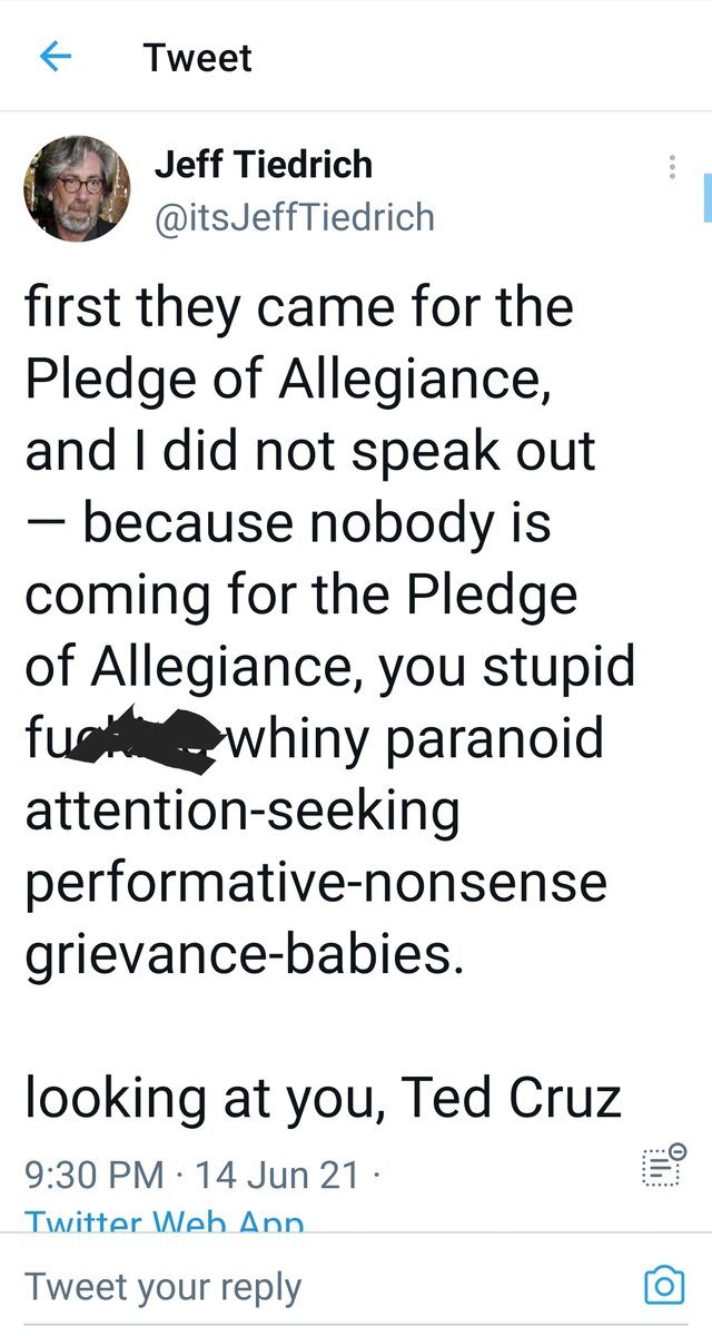 June 15, 20214 yr 5 minutes ago, M.C. said: "Please hate the Pledge of Allegiance!" Is anyone more pathetic than Ted Cruz?