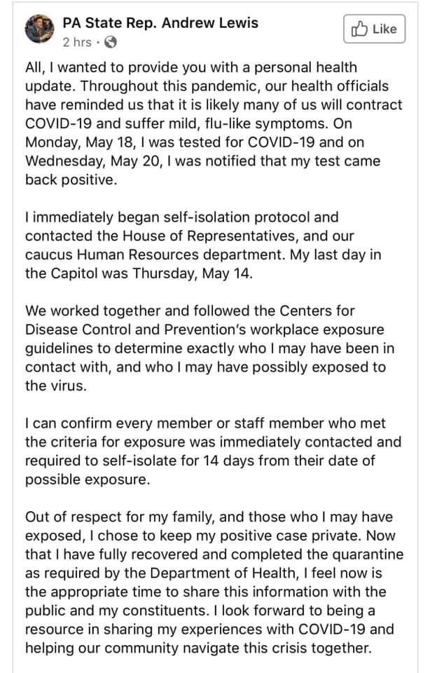 May 28, 20205 yr Author 4 hours ago, L.E said: This is big. The Rep in question is Andrew Lewis who put out this statement: That date of May 14 is important because one of the other now quarantined reps, Loudmouth Russ Diamond, spoke at a reopen PA rally on May 15, sans mask, potentially exposing hundreds of other idiots to the virus. Also there are many democrats calling BS on Lewis claim that he informed everyone. Democrats didn’t know anything until this news came out.