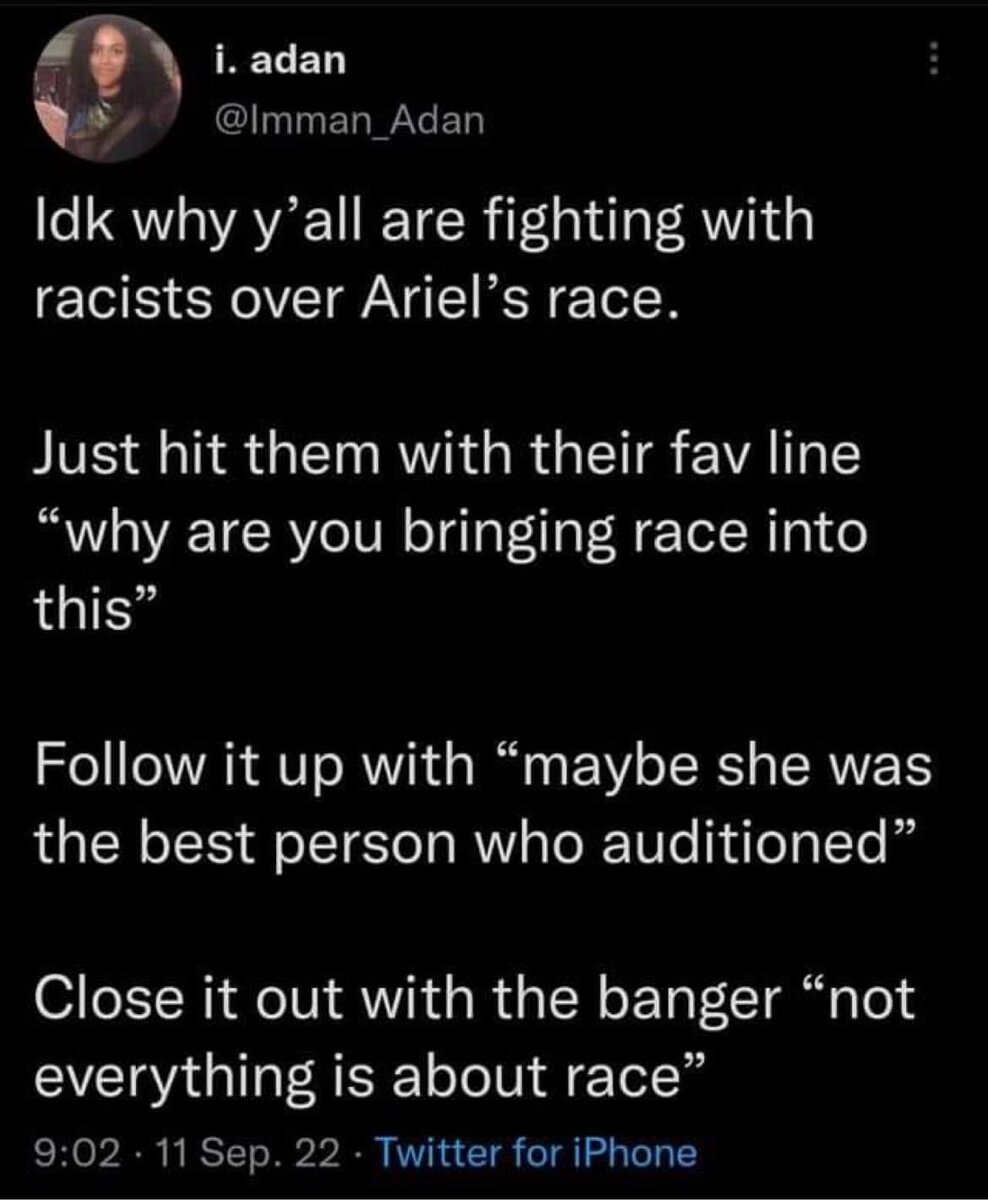 September 15, 20223 yr 1 minute ago, 20dawk4life said: Why is it ok to appropriate our culture? The little mermaid is a Danish story. Get your own damn mermaid stories. The Disney story and the Danish story have about as much in common with each other as the Dark Tower series of books and movie do.