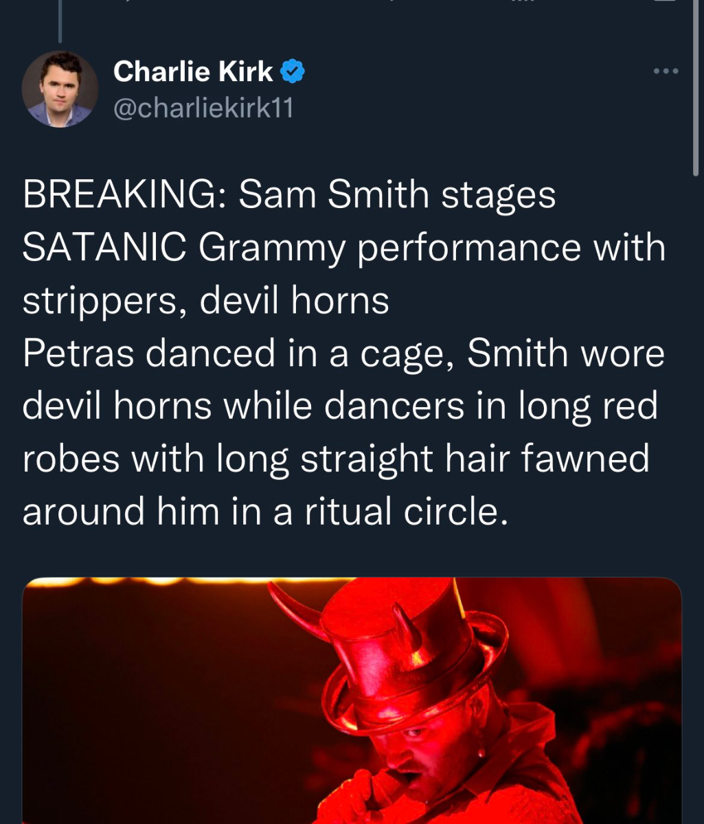 February 6, 20232 yr Lots of right-wing pearl-clutching over a Grammy performance last night with devil imagery. Quote "This…is…evil,” senator Ted Cruz wrote on social media while sharing a post from conservative political commentator Liz Wheeler, who similarly reacted: "Don’t fight the culture wars, they say. Meanwhile demons are teaching your kids to worship Satan. I could throw up.” "I know we on the right probably use the word satanic too often but this performance from Sam Smith is literally a tribute to Satan,” wrote Human Events editor Ben Kew.