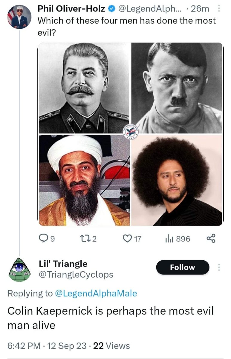 September 5, 20232 yr 15 minutes ago, Toastrel said: I agree with their decision to cover their faces. FFS People choosing to love/hate others based solely on the color of skin they were born with is his only chance.