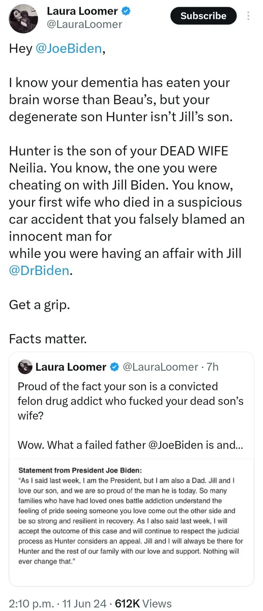 June 14, 20241 yr On 6/12/2024 at 9:28 AM, Tweek said: Absolutely appalling Facts do matter. Laura does not accept them.
