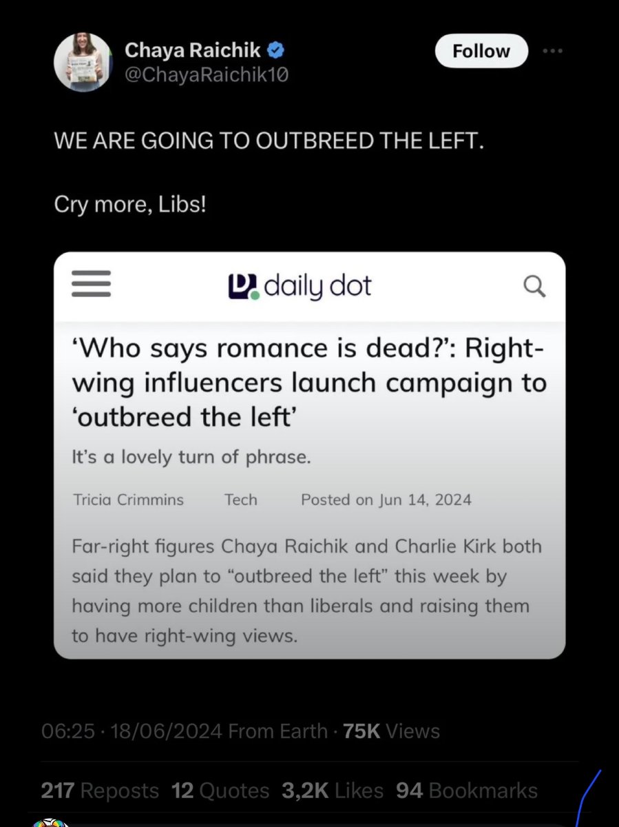 June 18, 20241 yr 5 hours ago, Tweek said: Soooo literally grooming...again Grand Ole Projection party. Love that it's breeding for purpose of having more kids than Democrats and not, hey we love kids and want to raise kids. I'd like to see them try. Many kids that are raised in bible-thumping wing-nut homes come to despise their parents views and rebel.