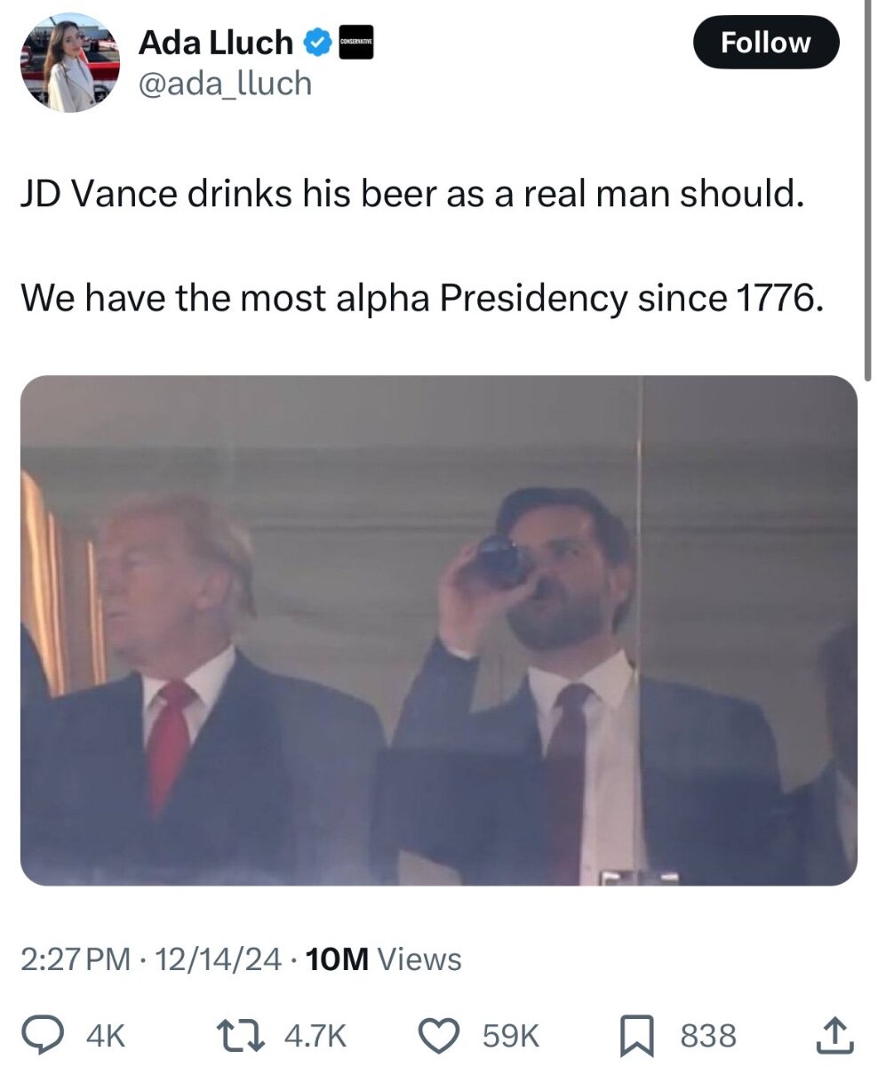 December 17, 2024Dec 17 24 minutes ago, we_gotta_believe said: Aside from that, it doesn't even make sense when Trump himself doesn't drink at all. You know how I can tell if someone is alpha? By the amount of people assuring me they're alpha.