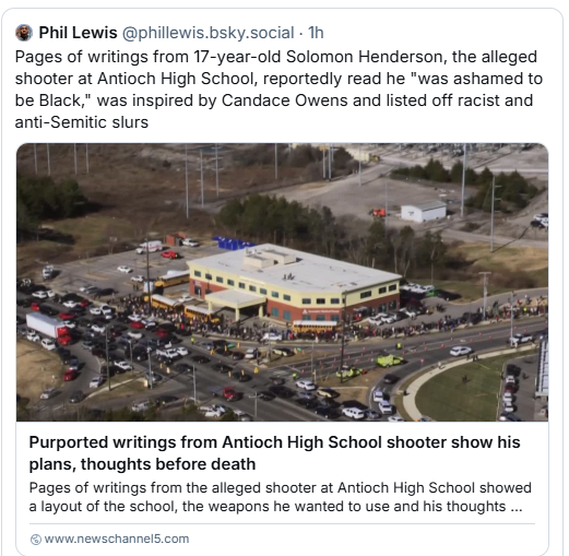 January 23Jan 23 1 hour ago, mr_hunt said: More so called influencers. School is a daycare,' he wrote. 'It's impossible for you to actually think. You say things because other people have said it before, then go repeat ad nauseum somewhere else. 'In school, we're taught to wake up early, shut up, sit for long periods of hours, do tasks you hate, then repeat.' The manifesto includes pictures of the weapons he intended to use in the slaying and said he had been advised on how to carry out the attack by others online. The writings also cite Kanye West and state that the gunman prepared for the shooting by playing violent video games and parroted parts of other famous killers' manifestos. Owens refuted the authenticity of the manifesto and said it was, 'sickening that people would use the death of a young 16 year old girl to try to quickly score political points' 'Regarding the alleged "manifesto”, it is an obvious troll,' Owens wrote on X. 'That is how it is plausible that both me and Mr. Beast, who clearly do not share the same politics, wind up once again in a manifesto. 'It also explains why this individual, despite his numerous accounts, never followed me or Mr. Beast on any of his socials. This is a deranged troll that is, at least in part, due to the death of journalism.'